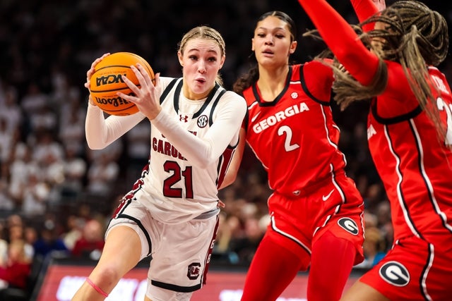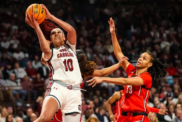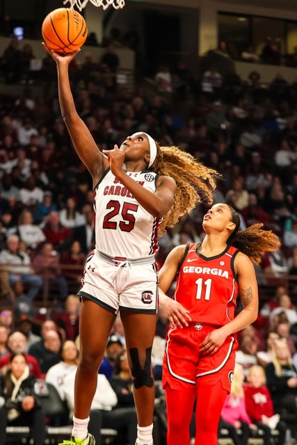 South Carolina Gamecocks forward Chloe Kitts (21) drives against the Georgia Lady Bulldogs in the second half at Colonial Life Arena.South Carolina Gamecocks head coach Dawn Staley directs her team against the Georgia Lady Bulldogs in the second half at Colonial Life Arena.South Carolina Gamecocks guard Raven Johnson (25) drives past Georgia Lady Bulldogs guard Asia Avinger (11) in the first half at Colonial Life Arena.South Carolina Gamecocks guard Bree Hall (23) makes a three-point basket against the Georgia Lady Bulldogs in the first half at Colonial Life Arena.South Carolina Gamecocks center Kamilla Cardoso (10) shoots over Georgia Lady Bulldogs forward Destiny Thomas (33) in the first half at Colonial Life Arena.South Carolina Gamecocks guard Te-Hina Paopao (0) celebrates a three-point basket against the Georgia Lady Bulldogs in the first half at Colonial Life Arena.South Carolina Gamecocks guard Raven Johnson (25) attempts a three point basket against the Georgia Lady Bulldogs in the first half at Colonial Life Arena.South Carolina Gamecocks center Kamilla Cardoso (10) is introduced before the game against the Georgia Lady Bulldogs at Colonial Life Arena.
