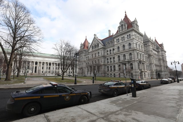 Hes Dr 092021 HarrisburNew York State police cruisers parked along a closed State Street beside the New York State Capitol Park in Albany on January 20, 2021.