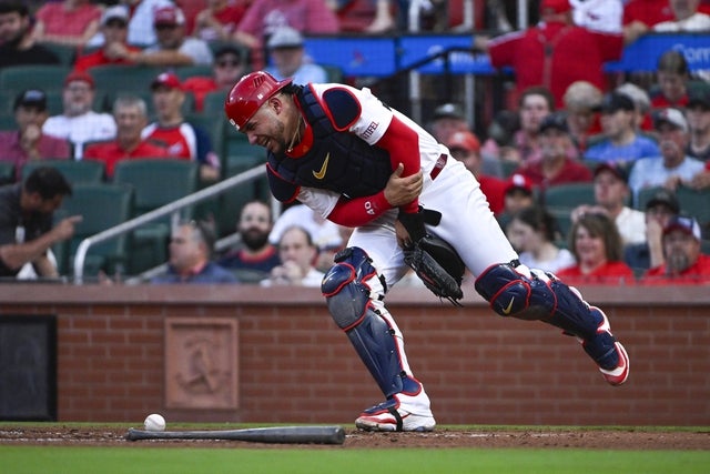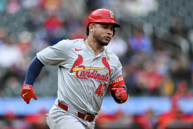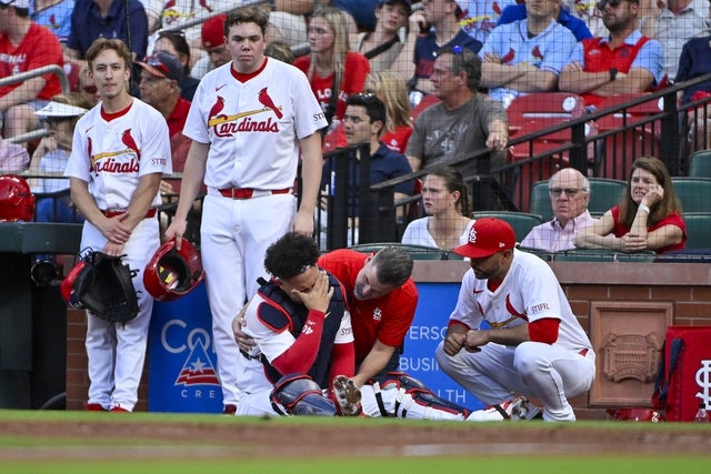 St. Louis Cardinals catcher Willson Contreras (40) hits a single during the first inning against the New York Mets at Citi Field.St. Louis Cardinals catcher Willson Contreras (40) reacts after fracturing his left arm during the second inning against the New York Mets at Busch Stadium.St. Louis Cardinals catcher Willson Contreras (40) reacts after fracturing his left arm during the second inning against the New York Mets at Busch Stadium.St. Louis Cardinals catcher Willson Contreras (40) is checked on by a trainer and manager Oliver Marmol (37) after fracturing his left arm during the second inning against the New York Mets at Busch Stadium.St. Louis Cardinals catcher Willson Contreras (40) is checked on by a trainer and manager Oliver Marmol (37) after fracturing his left arm during the second inning against the New York Mets at Busch Stadium.St. Louis Cardinals catcher Willson Contreras (40) is checked on by a trainer and manager Oliver Marmol (37) after fracturing his left arm during the second inning against the New York Mets at Busch Stadium.