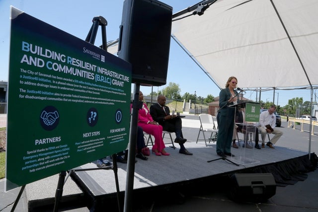 The enmarket Arena sits along the Springfield Canal on Savannah's westsideThe Springfield Canal runs alongside the enmarket Arena in SavannahThe Springfield Canal runs between the enmarket Arena and a parking lotFEMA Administrator Deanne Criswell speaks during a ceremony to announce BRIC Grant funding for the Springfield Canal on Tuesday, April 23, 2024 near the enmarket ArenaSavannah Mayor Van Johnson talks with FEMA Administrator Deanne Criswell alongside the Springfield Canal on Tuesday, April 23, 2024 near the enmarket Arena. The City has received a BRIC Grant to help with improvements to the canal and surrounding communitiesThe City of Savannah has received BRIC Grant funding for improvements to the Springfield Canal, which will help with drainage issues in the Carver Village and Cloverdale communitiesJames C. Stallings, GEMA/ Homeland Security director, speaks on Tuesday, April 23, 2024 during a press conference to announce BRIC Grant funding for improvements to the Springfield CanalFEMA Administrator Deanne Criswell speaks during a ceremony to announce BRIC Grant funding for the Springfield Canal on Tuesday, April 23, 2024 near the enmarket ArenaSavannah Mayor Van Johnson talks with FEMA Administrator Deanne Criswell alongside the Springfield Canal on Tuesday, April 23, 2024 near the enmarket Arena. The City has received a BRIC Grant to help with improvements to the canal and surrounding communitiesTom Perez, White House Office of Intergovernmental Affairs director and senior advisor to the President, speaks during a press conference to announce BRIC Grant funding for the Springfield CanalBernetta Lanier, alderwoman for district 1, speaks during a special ceremony on Tuesday, April 23, 2024 to announce BRIC Grant funding for the Springfield Canal
