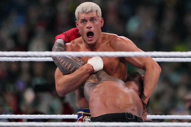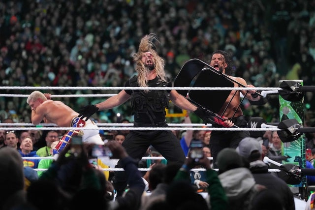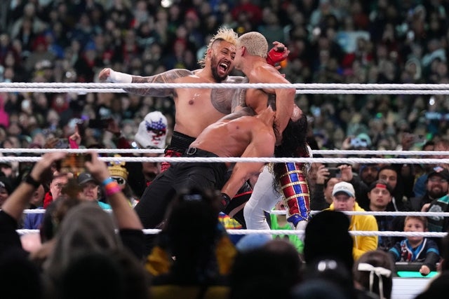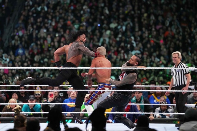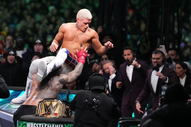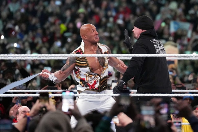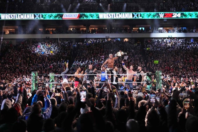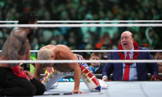 during Wrestlemania XL Sunday at Lincoln Financial Field.WWE Universal Championship match between Roman Reigns and Cody Rhodes during Wrestlemania XL Sunday at Lincoln Financial Field.Cody Rhodes and Triple H embrace during Wrestlemania XL Sunday at Lincoln Financial Field.Seth Rollins interferes during the WWE Universal Championship match between Roman Reigns and Cody Rhodes during Wrestlemania XL Sunday at Lincoln Financial Field.The Rock and The Undertaker interfere in the WWE Universal Championship match between Roman Reigns and Cody Rhodes during Wrestlemania XL Sunday at Lincoln Financial Field.The Rock and John Cena interfere during the WWE Universal Championship match between Roman Reigns and Cody Rhodes during Wrestlemania XL Sunday at Lincoln Financial Field.Solo Sikoa interferes during the WWE Universal Championship match between Roman Reigns and Cody Rhodes during Wrestlemania XL Sunday at Lincoln Financial Field.WWE Universal Championship match between Roman Reigns and Cody Rhodes during Wrestlemania XL Sunday at Lincoln Financial Field.WWE Universal Championship match between Roman Reigns and Cody Rhodes during Wrestlemania XL Sunday at Lincoln Financial Field.WWE Universal Championship match between Roman Reigns and Cody Rhodes during Wrestlemania XL Sunday at Lincoln Financial Field.WWE Universal Championship match between Roman Reigns and Cody Rhodes during Wrestlemania XL Sunday at Lincoln Financial Field.Paul Heyman reacts during the WWE Universal Championship match between Roman Reigns and Cody Rhodes during Wrestlemania XL Sunday at Lincoln Financial Field.WWE Universal Championship match between Roman Reigns and Cody Rhodes during Wrestlemania XL Sunday at Lincoln Financial Field.WWE Universal Championship match between Roman Reigns and Cody Rhodes during Wrestlemania XL Sunday at Lincoln Financial Field.