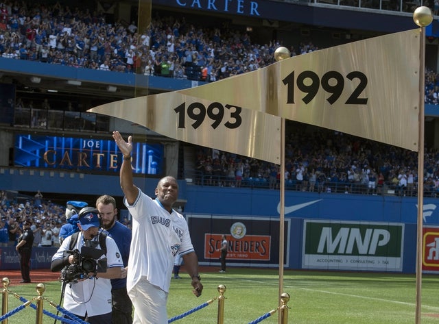 Former Toronto Blue Jays Joe Carter acknowledges the crowd during a pre game ceremony to honor Back to Back World Series wins in 1992 and 1993 before a game against the Tampa Bay Rays at Rogers Centre.Toronto Blue Jays outfielder Joe Carter in the dugout prior to the game against the Seattle Mariners at the Skydome.Cleveland Indians former player Joe Carter gives the thumbs up sign after throwing out the first pitch before a game against the Miami Marlins at Progressive Field.Former Toronto Blue Jay Joe Carter autographs a miniature basketball as the Toronto Raptors mascot looks on during a break in the action against the Cleveland Cavaliers at the Air Canada Centre. Toronto defeated Cleveland 87-81.Former MLB player Joe Carter tees off on the second during the third round of the CareerBuilder Challenge at PGA West - Stadium Course.Former player Joe Carter of the 1992 World Series champion Toronto Blue Jays during a ceremony before a game against the Los Angeles Angels at Rogers Centre.